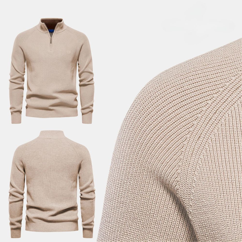 Crafted from a premium ribbed cotton-blend knit, this zip-neck sweater pairs tailored comfort with everyday versatility. The half-zip collar moves effortlessly from relaxed to refined, while reinforced ribs at the cuffs and hem keep the silhouette crisp after every wash.